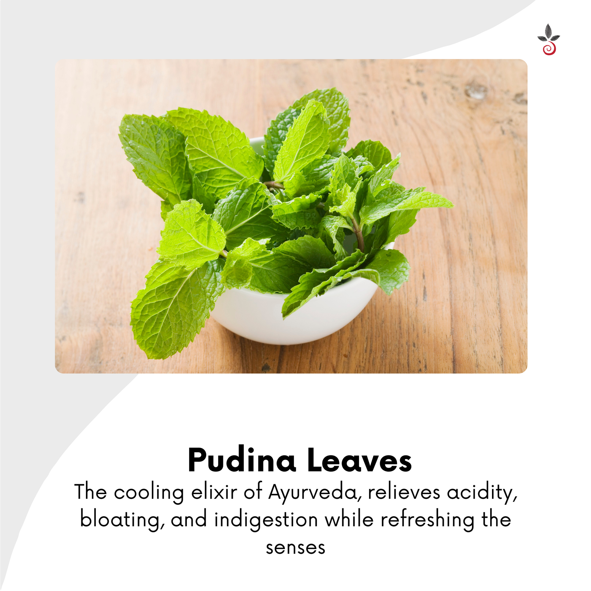 Pudina (Mint): The cooling elixir of Ayurveda, relieves acidity, bloating, and indigestion while refreshing the senses.