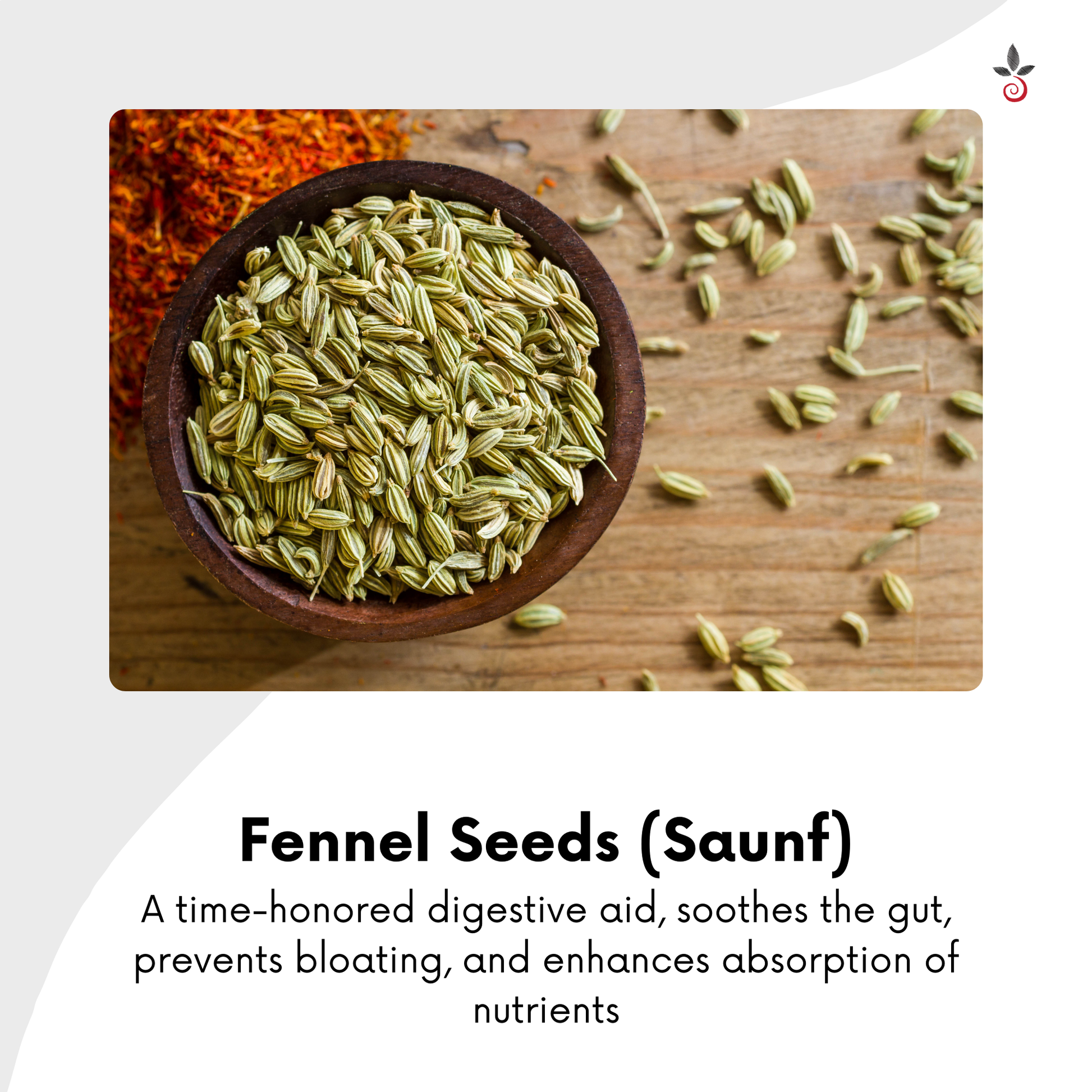 Fennel Seeds (Saunf): A time-honored digestive aid, soothes the gut, prevents bloating, and enhances absorption of nutrients.